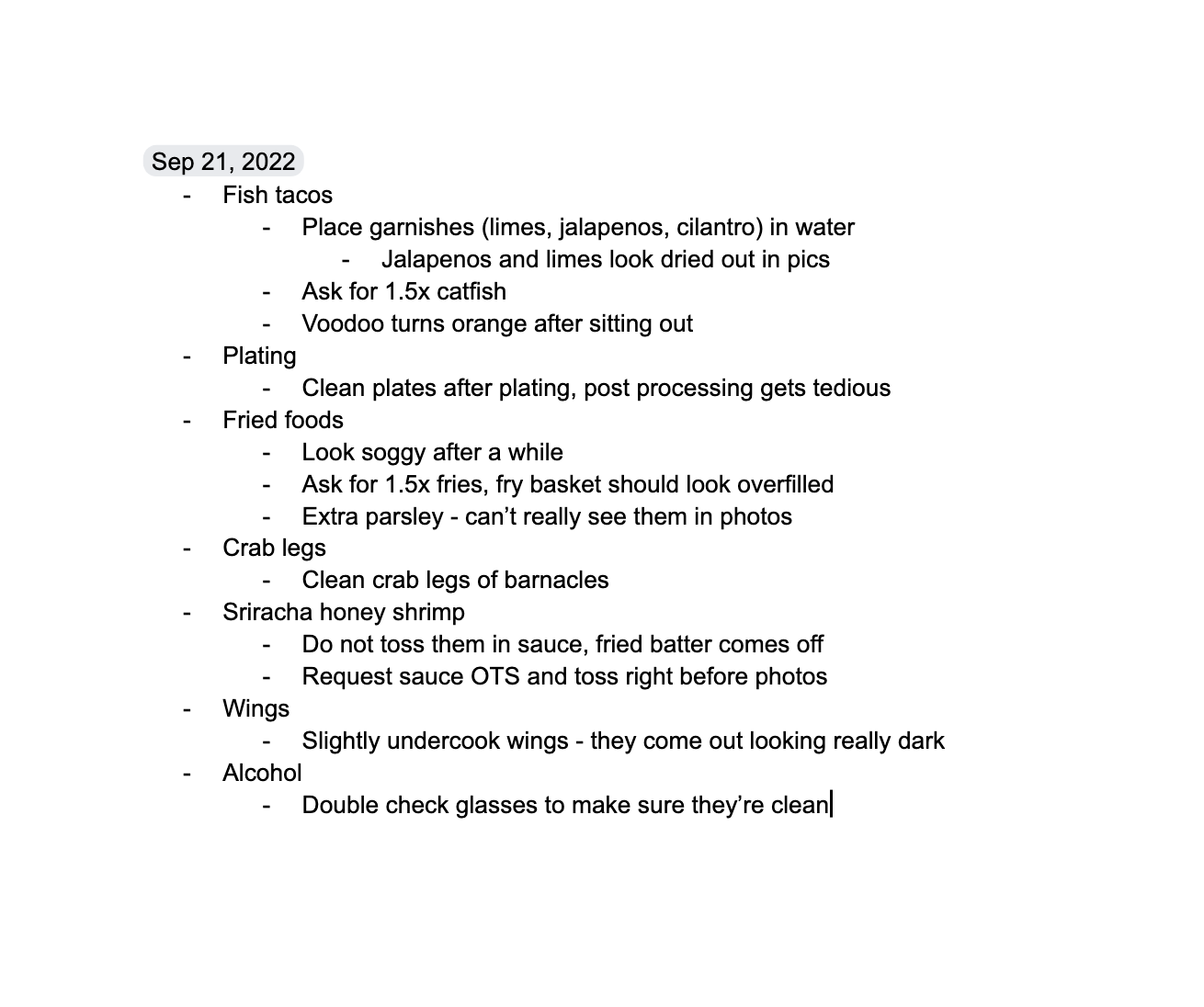 On the day of the shoot, I prepare and review the pre-shoot list. Throughout the day, I direct the shoot by coordinating with the relevant departments to ensure that all necessary items are captured. Following the shot list, I allow for creative flexibility while ensuring that all menu items are accounted for.